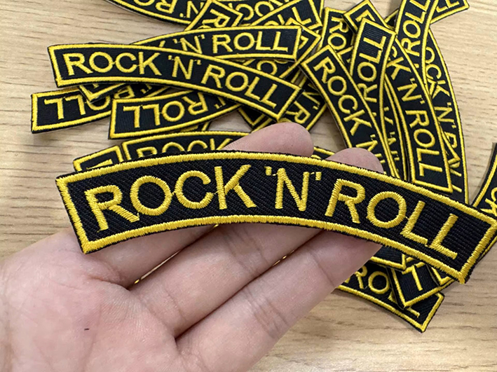 Legendaarinen ”Rock n Roll” brodeerattu kangasmerkki. n.10x2cm. Silitettävä kiinnitys.